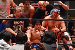 イサミは助走付けてトペ・スイシーダ(左写真)。イサミ一旦先にリングに戻るが、場外に出てGENTAROをカウント19でリングに入れる。15分経過。