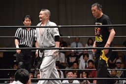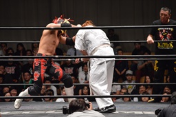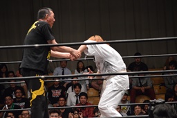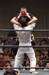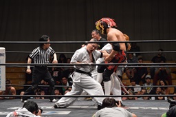 吹本がリングイン、ロックアップ(左写真)、吹本ロープに押し込む、ブレーク際にチョップ。
