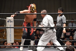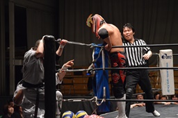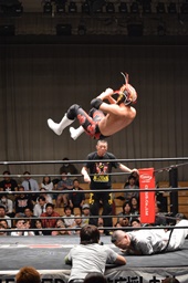コーナーに上ってダイビングセントーン(右写真)、カウント2。