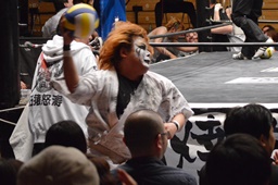 カラテバラモン「ワシに任せとけ!」と先発を買って出る、一方王者組の先発はグレート小鹿(左写真)。