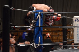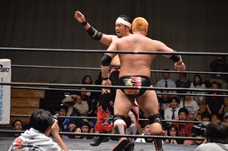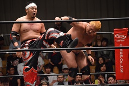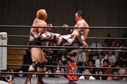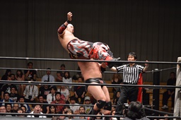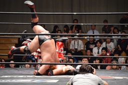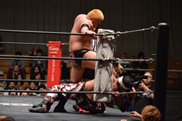 佐々木はカニばさみで倒してエルボードロップ、ドロップキック(右写真)。火野場外に。