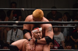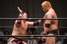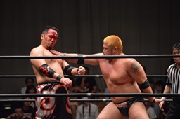 佐々木流血。火野はフェースロックに捕え胸板にチョップ(左写真)、カバー、カウント2。