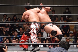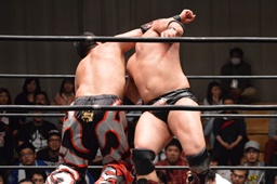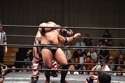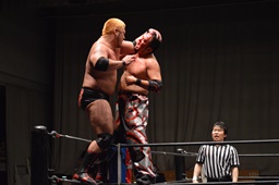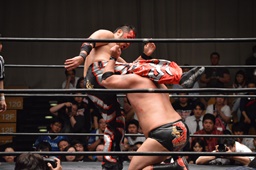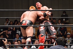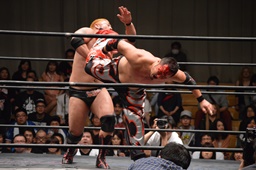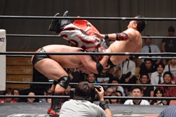 佐々木ロープに飛ぶ、火野ラリアット(右写真)、カバー、カウント1。