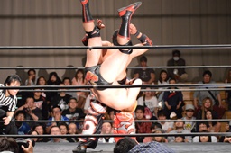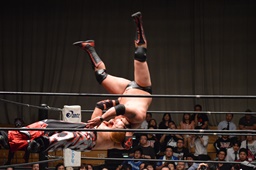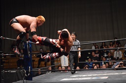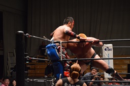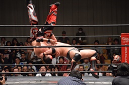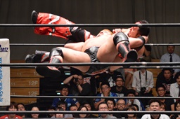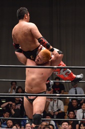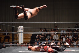 コーナーに上ってダイビングボディプレス(右写真)、カウント2。