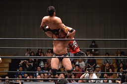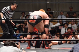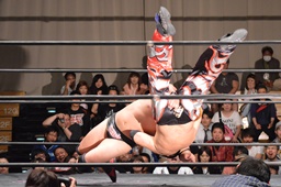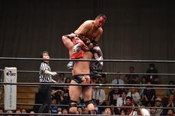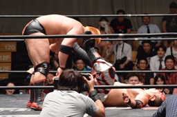 パワーボム(右写真)。ダブルノックダウン。火野カバー、カウント2。