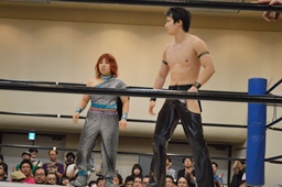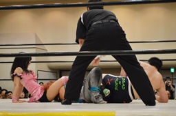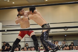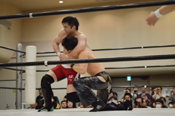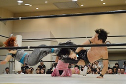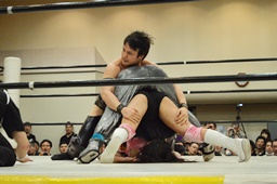 佐藤ブレーンバスター狙う、米山ブロックして逆に投げる(右写真)。5分経過。