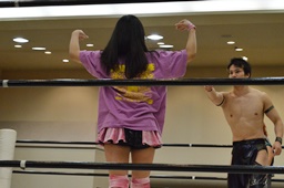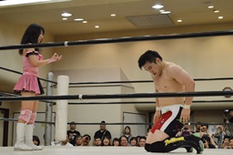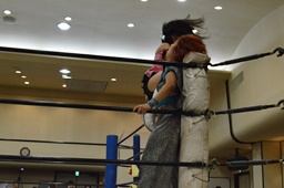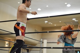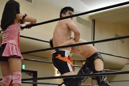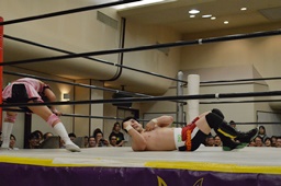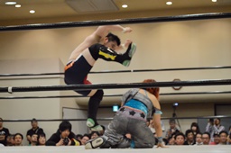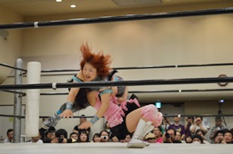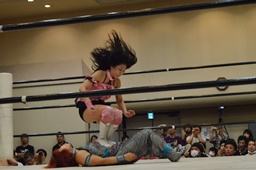 佐藤が米山をバックドロップの形で抱え上げて里歩がコーナーからダイビングニー(右写真)、カウント2。