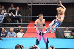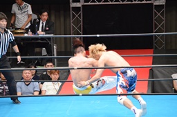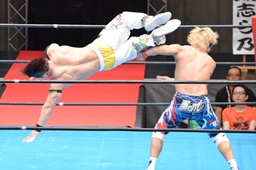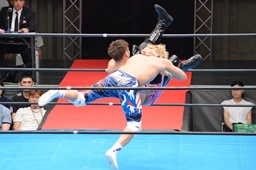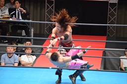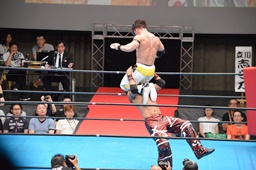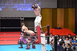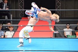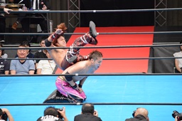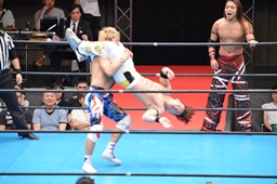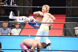 日高ドロップキック(左写真)、サマーソルトドロップ、ニードロップ。