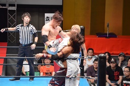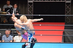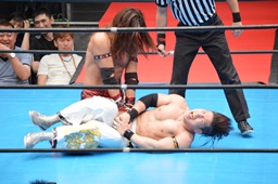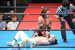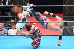 日高ブロックして野良犬ハイキック(左写真)、カウント2。日高は藤田にタッチ。