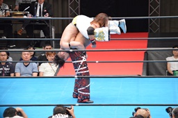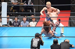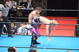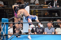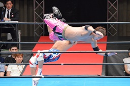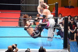 コーナーに上ってダイビングダブルニーアタック(左写真)、カウント2。