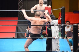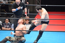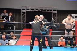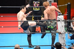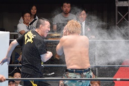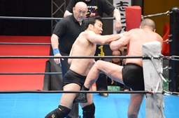 小鹿藤原をコーナーに詰めてダブルチョップ(左写真)。