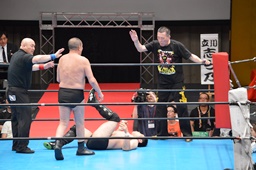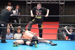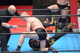 藤原アキレス腱固め、金原は小鹿にタッチ(右写真)。