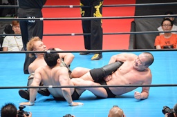 金原張り手打ち返す、藤原キャッチすると体重掛けてワキ固めに(右写真)、