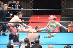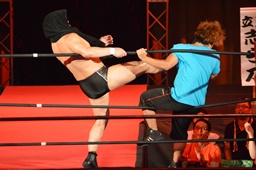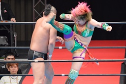 華名エルボー、鈴木ヒザ蹴り、コーナーの丸藤にビッグブーツ、丸藤場外転落。丸藤すぐにリングに戻ると鈴木にトラースキック(右写真)。