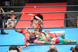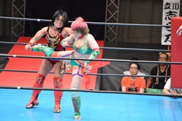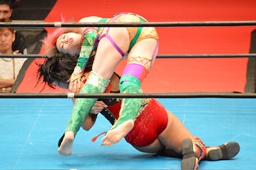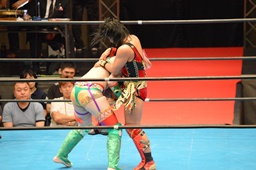 先発は華名と里村。里村鮮やかなアームドラッグ(右写真)。