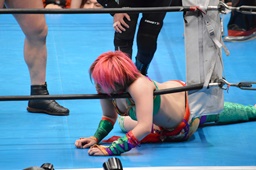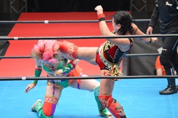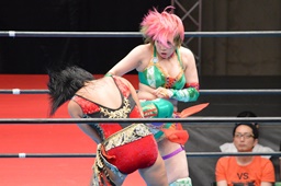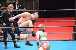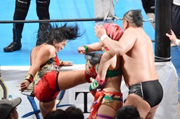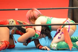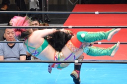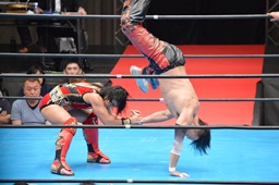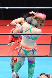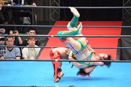 十字狙う、華名ブロック。里村担ぎ上げてバックフリップ(右写真)、鈴木にタッチ。