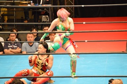 丸藤華名を呼び込んでダブルでロープに振る、華名ミドルキック、顔面ドロップキック(右写真)。