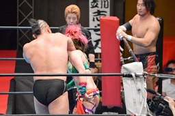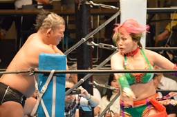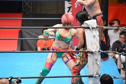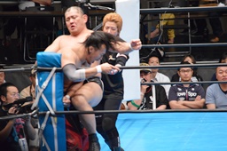 鈴木キック、華名をコーナーに投げつけて(右写真)丸藤を呼び込む。