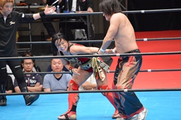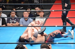 丸藤と里村ロックアップ、丸藤が腕をひねる(右写真)、里村切り返す。