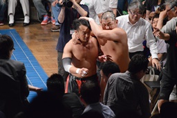 丸藤手四つから足をすくって倒す、鈴木は十字に切り返す(左写真)。