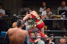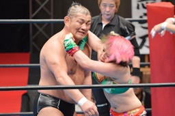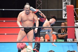鈴木丸藤をコーナーに詰めてヒザ蹴り(左写真)、里村にタッチ。