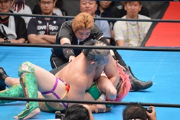 チョークスラム、バズソーキック(左写真)、鈴木にタッチ。