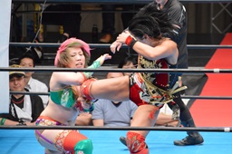 場外では鈴木が華名を押さえて里村がミドルキック(左写真)。