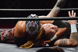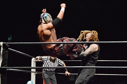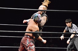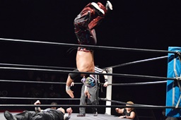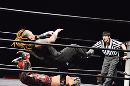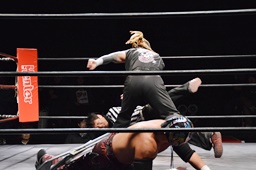 岸和田ラリアット、折原2回までかわすが岸和田は3回目でヒット(右写真)、カウント2。