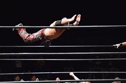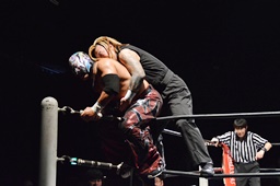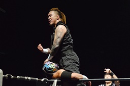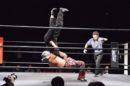 ボディスラムからコーナーに上ってムーンサルトプレス(右写真)、カウント2。