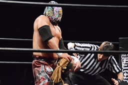 佐渡レフェリーが反則負け宣告(右写真)。