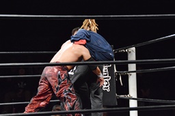 岸和田ボディスラム、ムーンサルト狙ってコーナーに上る、折原立ち上がって後ろからパンチ(左写真)、