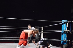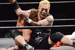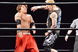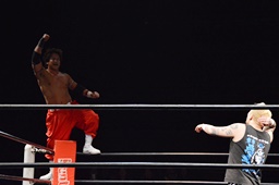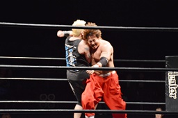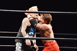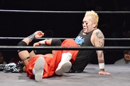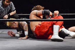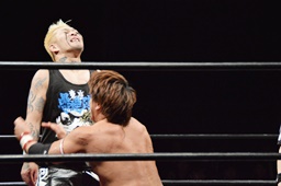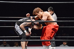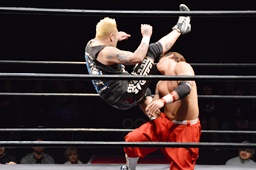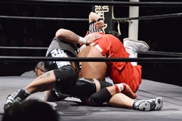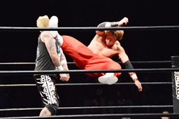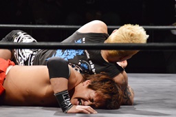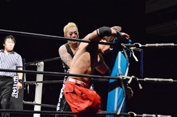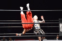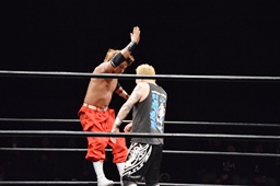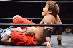 NOSAWA低空ドロップキック打ち込んで超高校級ラ・マヒストラル(左写真)、カウント3。