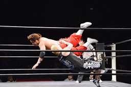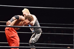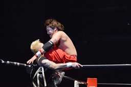 NOSAWADDT、ロープに振る、裕向ハンドスプリングエルボー(左写真)。10分経過。