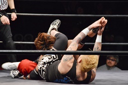 NOSAWAホイップ、裕向エルボードロップ落としレッグロック(右写真)、立ち上がってヘッドロックからフライングメイヤー、