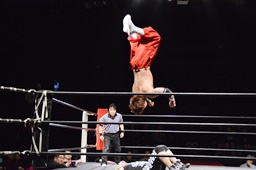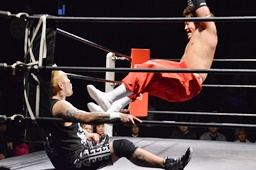 ムーンサルトプレス(右写真)、NOSAWAは両ヒザで受け止める。