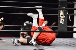 裕向ファイヤーサンダー狙うがNOSAWAは急所蹴りから首固め(左写真)、カウント2。