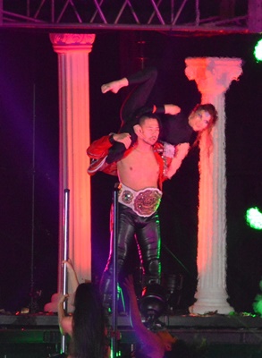 一方王者・中邑はポールダンサーを肩に担いで登場(右写真)。