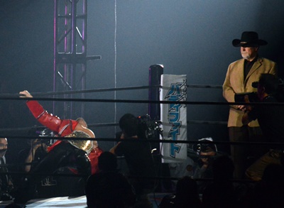 特別立会人のスタン・ハンセン氏がリングに上がってロングホーン(右写真)。
