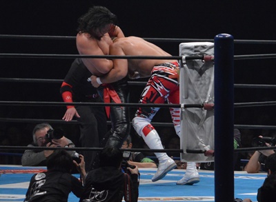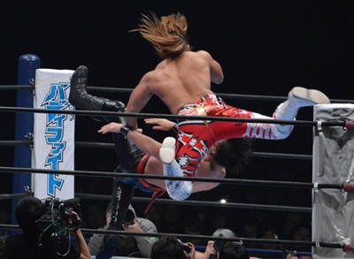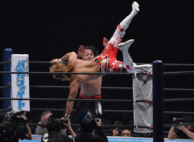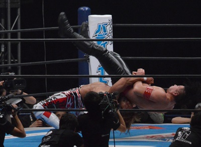 棚橋ドラゴン狙う、中邑ブロック、棚橋はだるまジャーマンにスイッチ(左写真)、カウント2。15分経過。