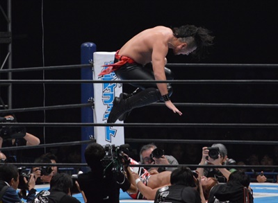 中邑キック連打、棚橋蹴り足を取るとドラゴンスクリュー、ロープに飛んでフライングフォアアーム(左写真)、