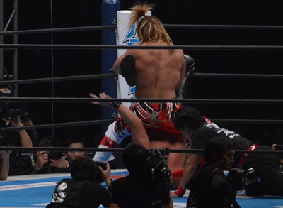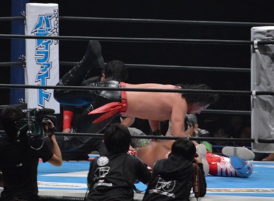 棚橋をエプロンに寝せてヒザ突き上げ、エプロンを走ってニードロップ(右写真)、これは棚橋かわす。