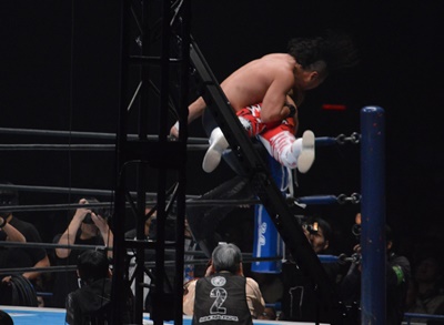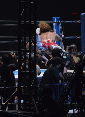 棚橋コーナーからハイフライフロー式プランチャ(左写真)。