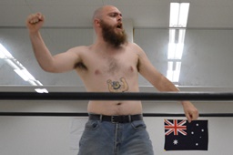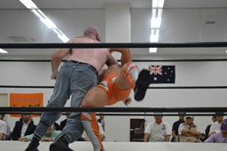 挑戦者・マッドドッグ入場(右写真)。オーストラリアのハードコア・レジェンドだそうだ。
