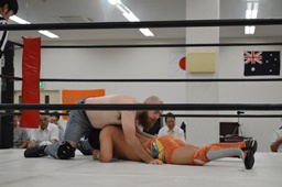 重野後方回転足折り固め(左写真)、カウント2。