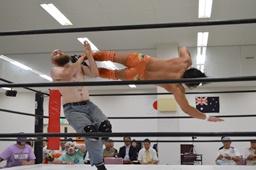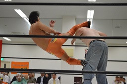 マッドドッグがロープに振ってラリアット、重野かわして延髄蹴り(右写真)、カウント2。