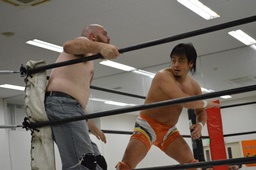 重野張り手(左写真)、ロープに逃げる。