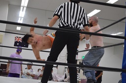 マッドドッグはジャックナイフに切り返し、カウント2。マッドドッグストレッチにスイッチ(左写真)、重野ロープ。