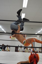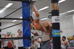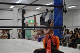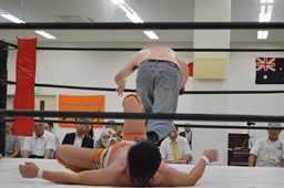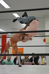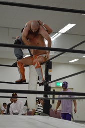 コーナーに上ってダイビングセントーン、重野の背中にヒット(右写真)、カウント2。