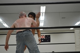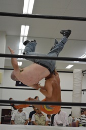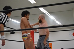 ロックアップ、マッドドッグバック取る、重野切り返す。重野タックル、マッドドッグ切る(右写真)。