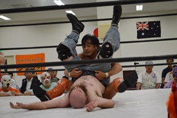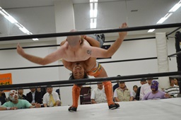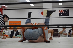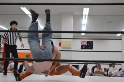 マッドドッグ肩に担ぐ、重野は回転エビ固めに(右写真)、カウント2、